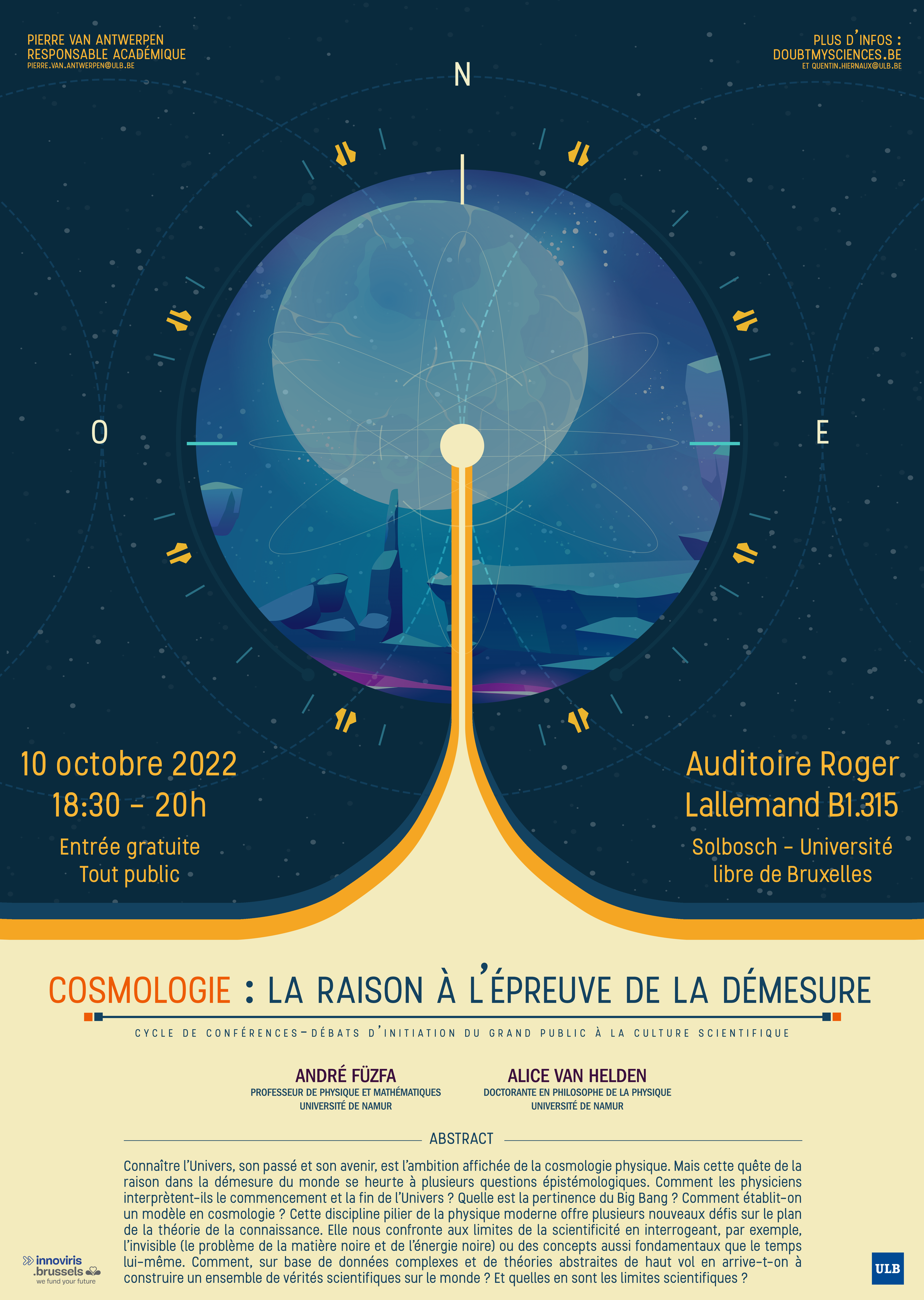 Connaître l’Univers, son passé et son avenir, est l’ambition affichée de la cosmologie physique. Mais cette quête de la raison dans la démesure du monde se heurte à plusieurs questions épistémologiques. Comment les physiciens interprètent-ils le commencement et la fin de l’Univers ? Quelle est la pertinence du Big Bang ? Comment établit-on un modèle en cosmologie ? Cette discipline pilier de la physique moderne offre plusieurs nouveaux défis sur le plan de la théorie de la connaissance. Elle nous confronte aux limites de la scientificité en interrogeant, par exemple, l’invisible (le problème de la matière noire et de l’énergie noire) ou des concepts aussi fondamentaux que le temps lui-même. Comment, sur base de données complexes et de théories abstraites de haut vol en arrive-t-on à construire un ensemble de vérités scientifiques sur le monde ? Et quelles en sont les limites scientifiques ?
