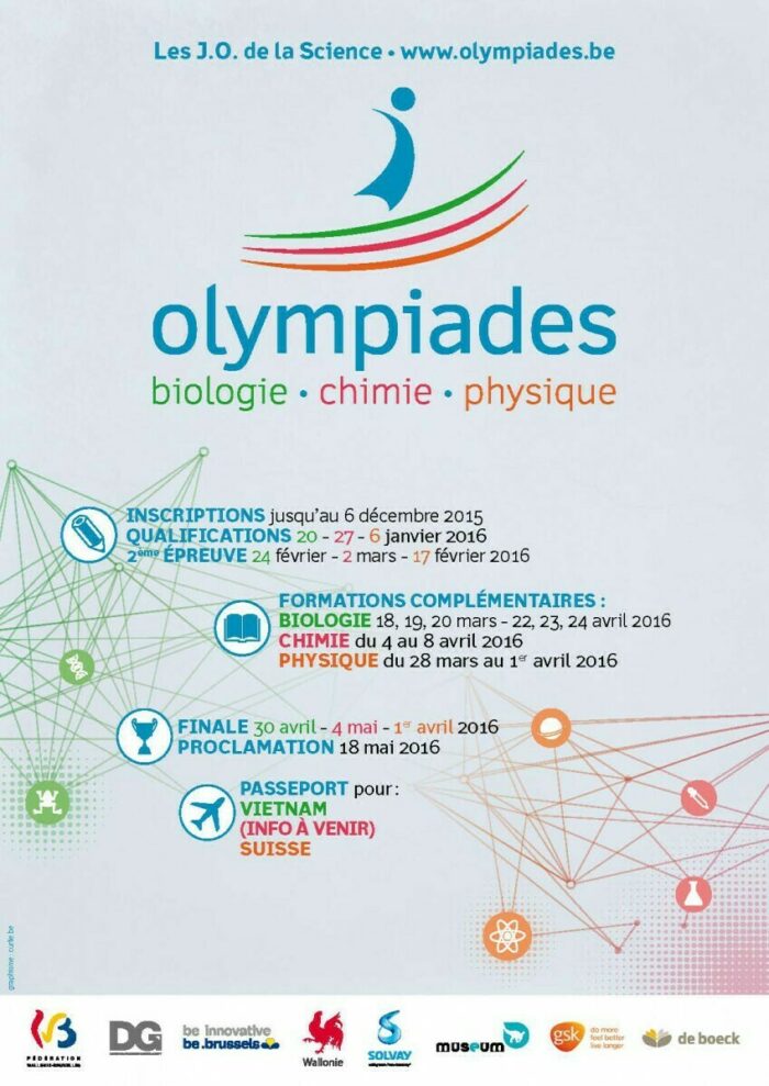 dimanche 1 novembre 2015 au dimanche 6 décembre 2015 @ – Les organisateurs doivent être en possession des inscriptions le 6 décembre à minuit via www.olympiades.be Chaque année, en juillet, les Olympiades internationales de Biologie, de Chimie et de Physique rassemblent des jeunes de fin d’enseignement secondaire venus de 60 à 90 pays du monde entier. Chaque délégation nationale est composée de 4 candidats (5 en physique) […]