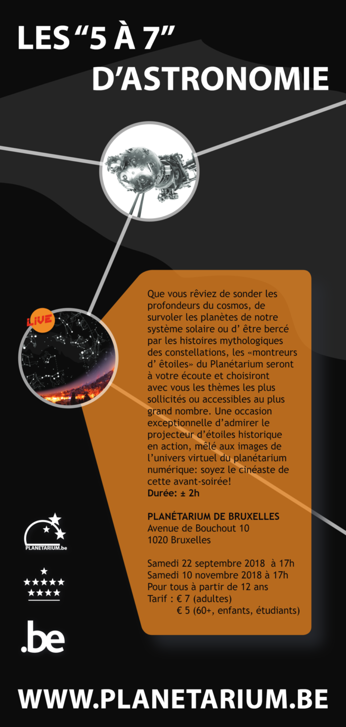 samedi 22 septembre 2018 @ 17h00 > 19h00 – Un voyage sensationnel pour dévoiler les secrets de l’univers Que vous rêviez de sonder les profondeurs du cosmos, de survoler les planètes de notre système solaire ou d’être bercé par les histoires mythologiques des constellations, les «montreurs d’étoiles» du Planétarium seront à votre écoute et choisiront avec vous les thèmes les plus sollicités ou accessibles au plus grand nombre. Une occasion exceptionnelle d’admirer le projecteur d’étoiles historique en […]
