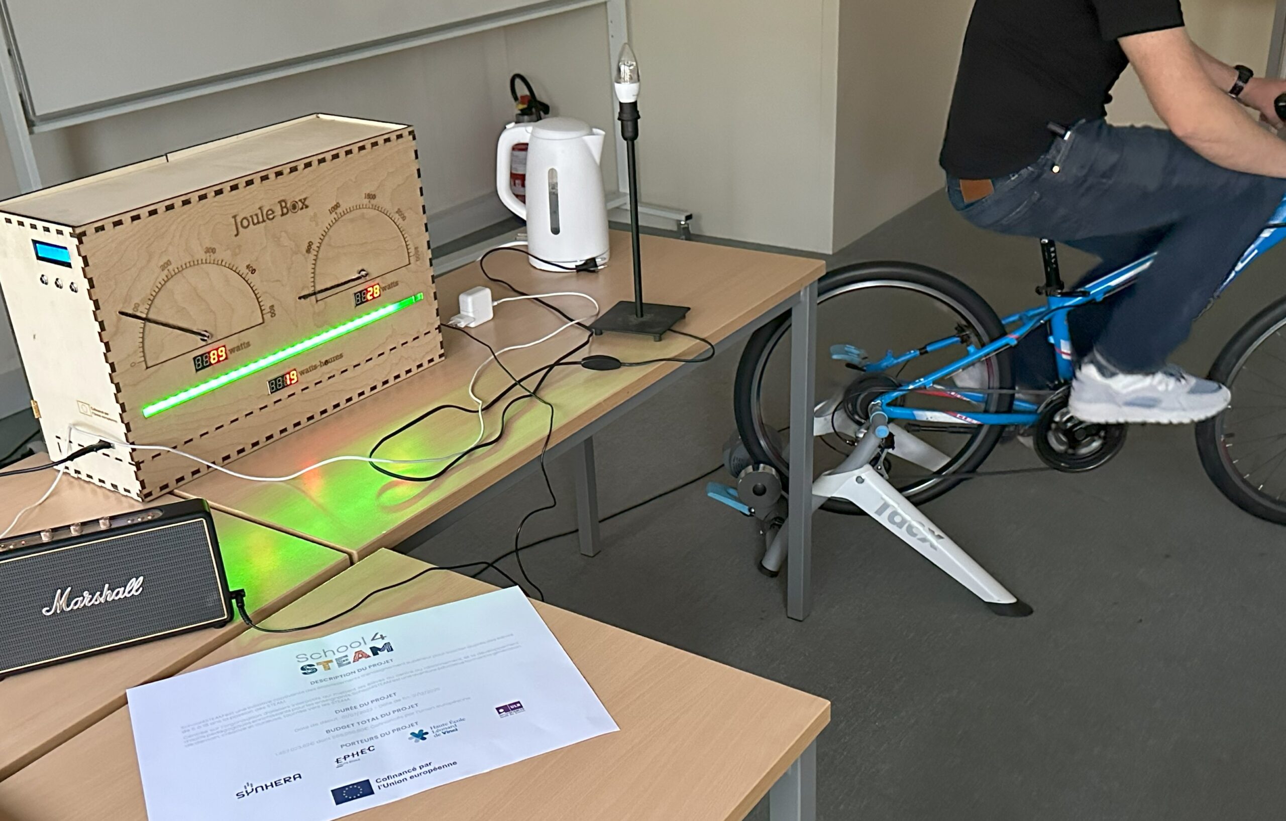 Pas de chance, la classe n’est plus alimentée en électricité ! Heureusement, la Joule Box, petite boîte mystérieuse, fournit aux élèves un soutien énergétique pour faire fonctionner lampes, chargeurs ou petits appareils électriques. Mais attention : quand la Joule Box est vide, il faut pédaler pour la recharger !